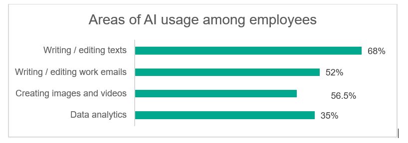 The vast majority of survey respondents in the Pakistan (98%) said that they understand what the term “generative artificial intelligence” means, and for many employees this knowledge is no longer just theoretical: AI tools have become part of their every workday. Overall, 86% of respondents use AI tools for work: 68% use AI to write or edit texts and 52% for work e-mails (, 56.5% to create images or videos with the help of neural networks while (35 use it for data analytics .